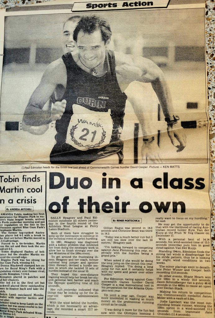 WA State Record Holder: Men's Open 4x100m relay: 39.51sec (Curtin University) | Men's Open 110m hurdles (9 years from 23/2/1995 - 28/2/2004): 14.14sec (-1.0) | M35 110m hurdles: (99cm) 16.48sec | M40 60m: 7.27sec & 110m hurdles (99cm): 15.72sec.
